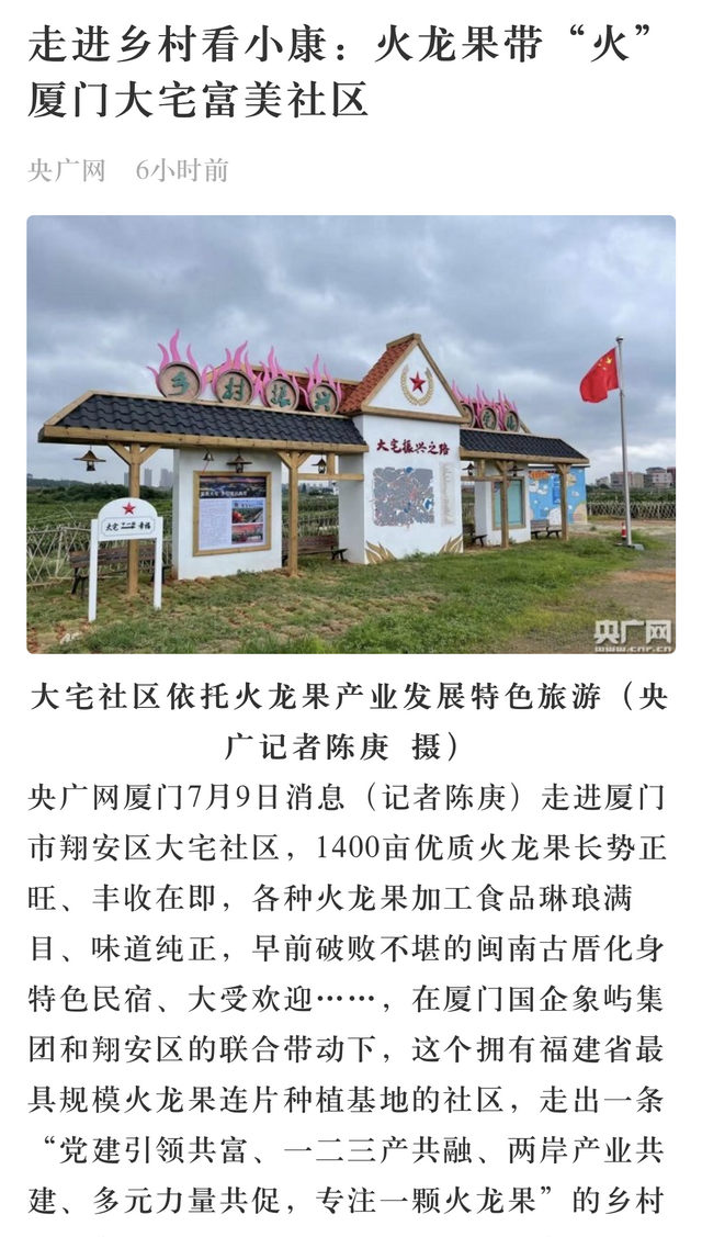 翔安大宅社区坐落于香山西麓,火龙果种植面积达1400亩,先后被评为全国“一村一品”示范村、福建省党建富民强村示范基地、厦门市级乡村振兴示范村等。不过,种植火龙果的基地不少,为什么就“火”了翔安大宅?